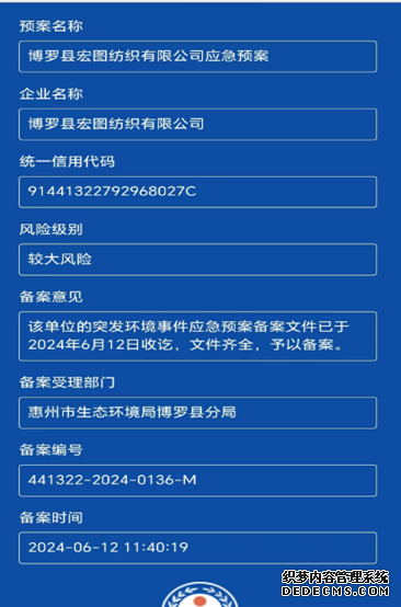 突發(fā)環(huán)境事件應(yīng)急預(yù)案    已制訂《博羅縣宏圖紡織有限公司突發(fā)環(huán)境事件應(yīng)急預(yù)案》,并于2024年 6月12日在惠州市生態(tài)環(huán)境局博羅分局備案,備案編號:441322-2024-0136-M