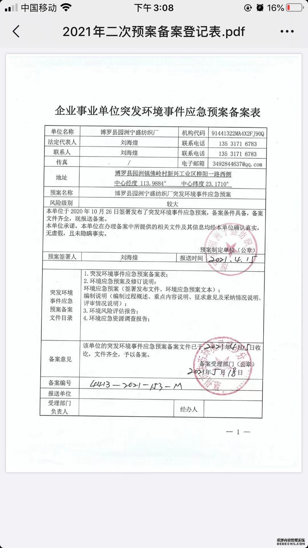 附件鏈接: 《博羅縣園洲寧盛紡織廠突發(fā)環(huán)境事件應(yīng)急預(yù)案備案登記表》