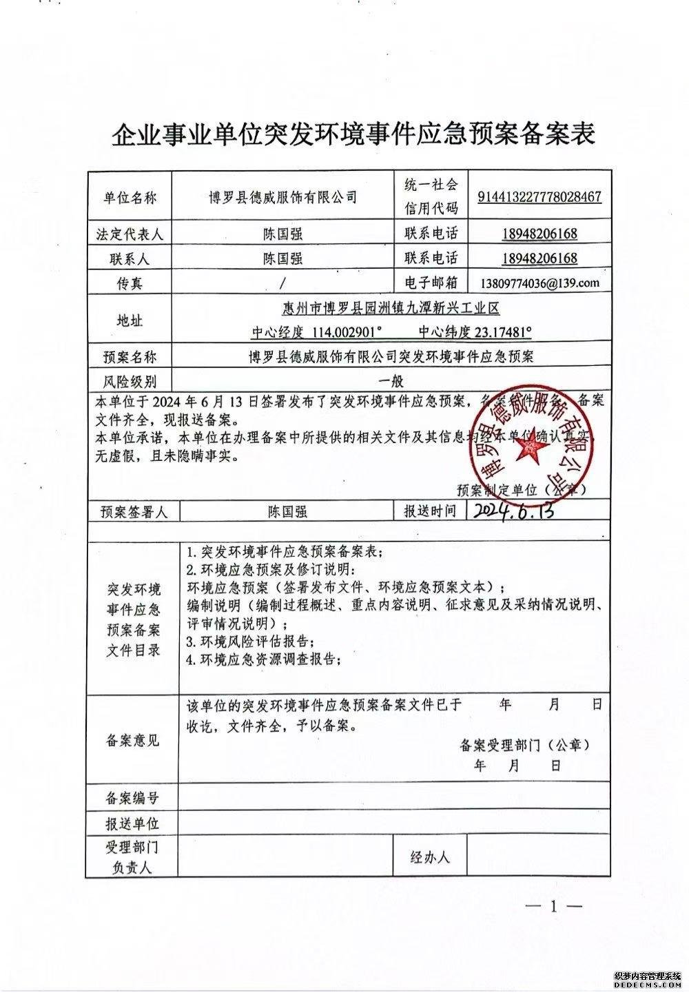 已制訂《博羅縣德威服飾有限公司環(huán)境風(fēng)險(xiǎn)評(píng)估報(bào)告》,并于2017年10月26日上報(bào)博羅縣環(huán)境保護(hù)局備案;