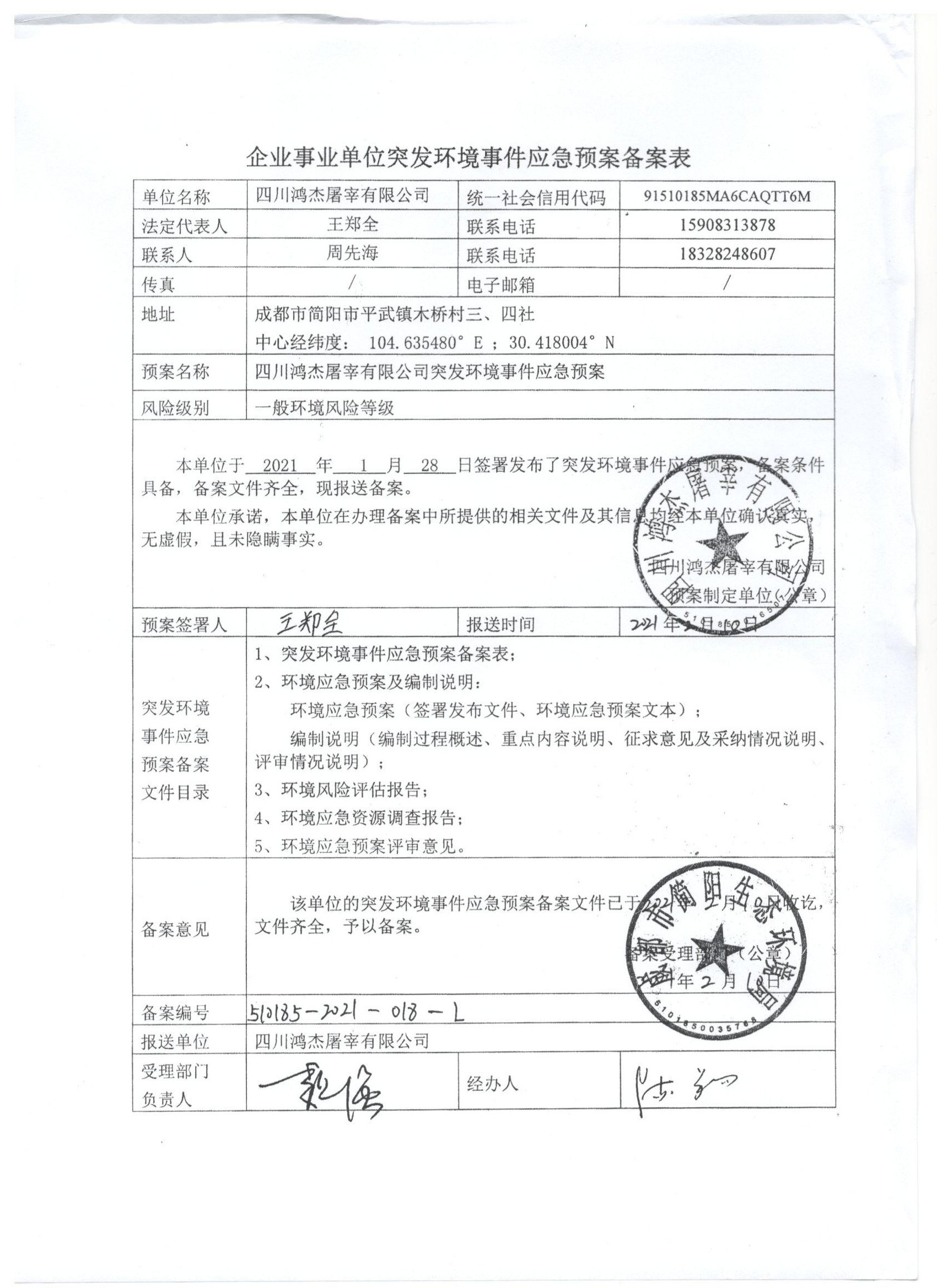 已制訂《四川鴻杰屠宰有限公司突發(fā)環(huán)境事件應(yīng)急預(yù)案》,并于2021年 2月 12日在成都市簡(jiǎn)陽(yáng)生態(tài)環(huán)境局備案, 備案編號(hào):510185-2021-018-L 附件鏈接: 《四川鴻杰屠宰有限公司突發(fā)環(huán)境事件應(yīng)急預(yù)案》電子版(點(diǎn)擊打開); |